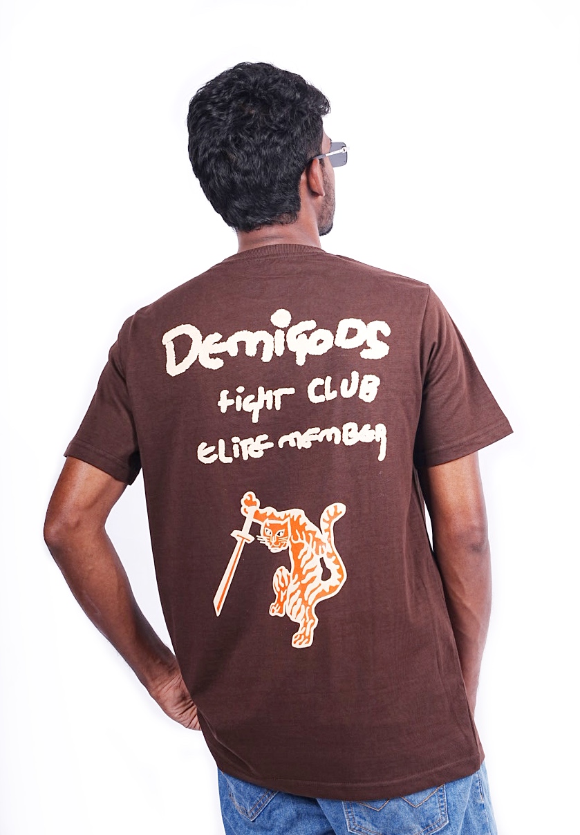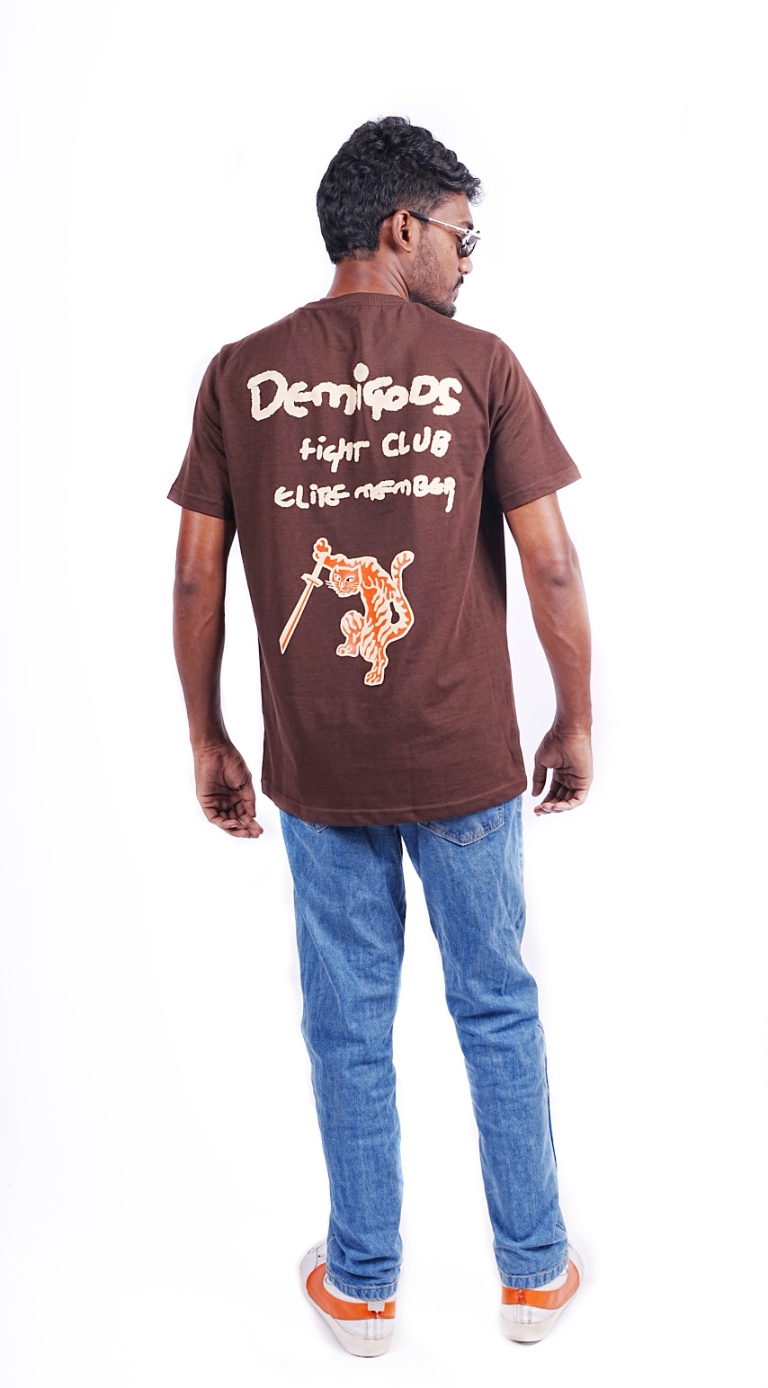 Color: Brown Fabric: Premium 100% Cotton Sinker – 260 GSM Fit: Regular Fit – Comfortable and relaxed for all-day wear Print: Bold back graphic featuring “Demigods Fight Club Elite Member” in a hand-drawn style, with a fierce orange tiger wielding a sword — symbolic of raw strength and elite spirit. Quality: Ultra-soft finish with durable stitching and excellent shape retention. Breathable and ideal for everyday wear.