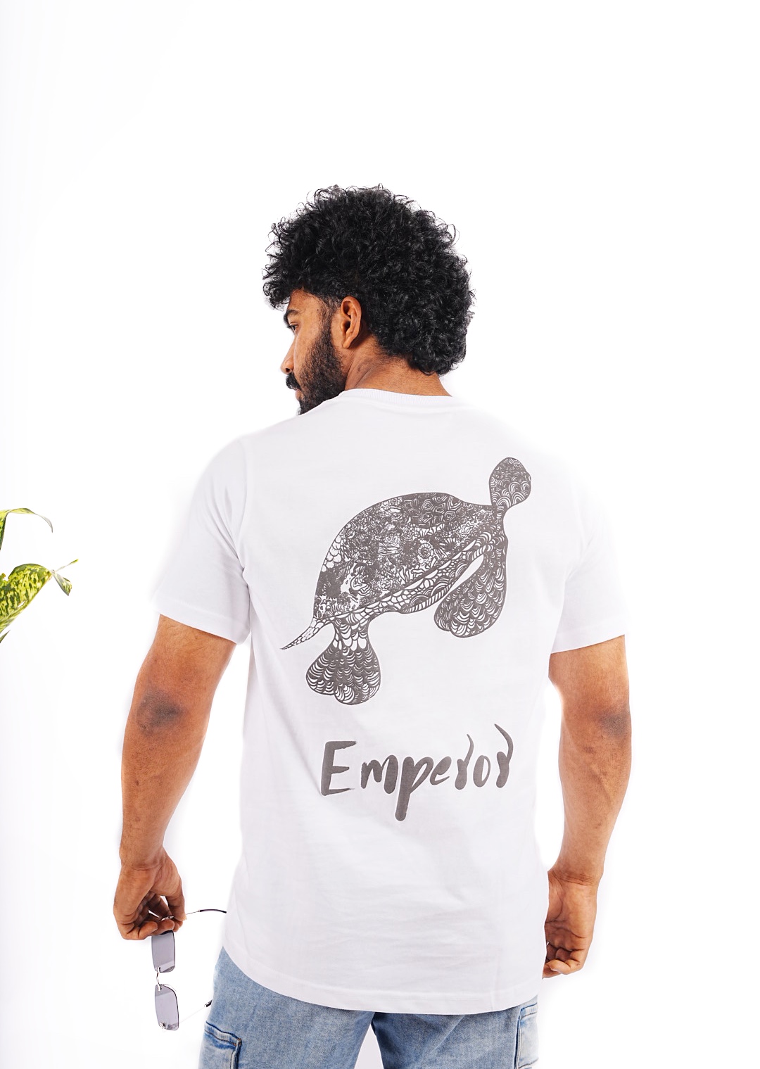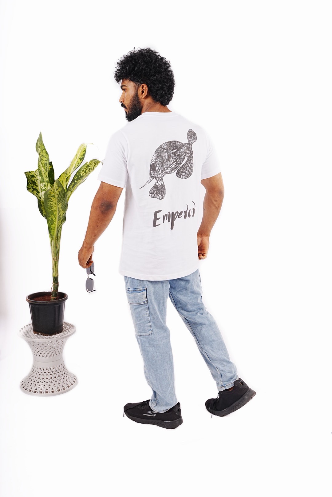 - Graphic Print: The standout feature is the detailed sea turtle graphic on the back. Designed with complex mandala-inspired patterns, it reflects oceanic beauty and mindfulness. Below the turtle, “Emperor” is written in a stylized, artistic font that adds a signature edge.